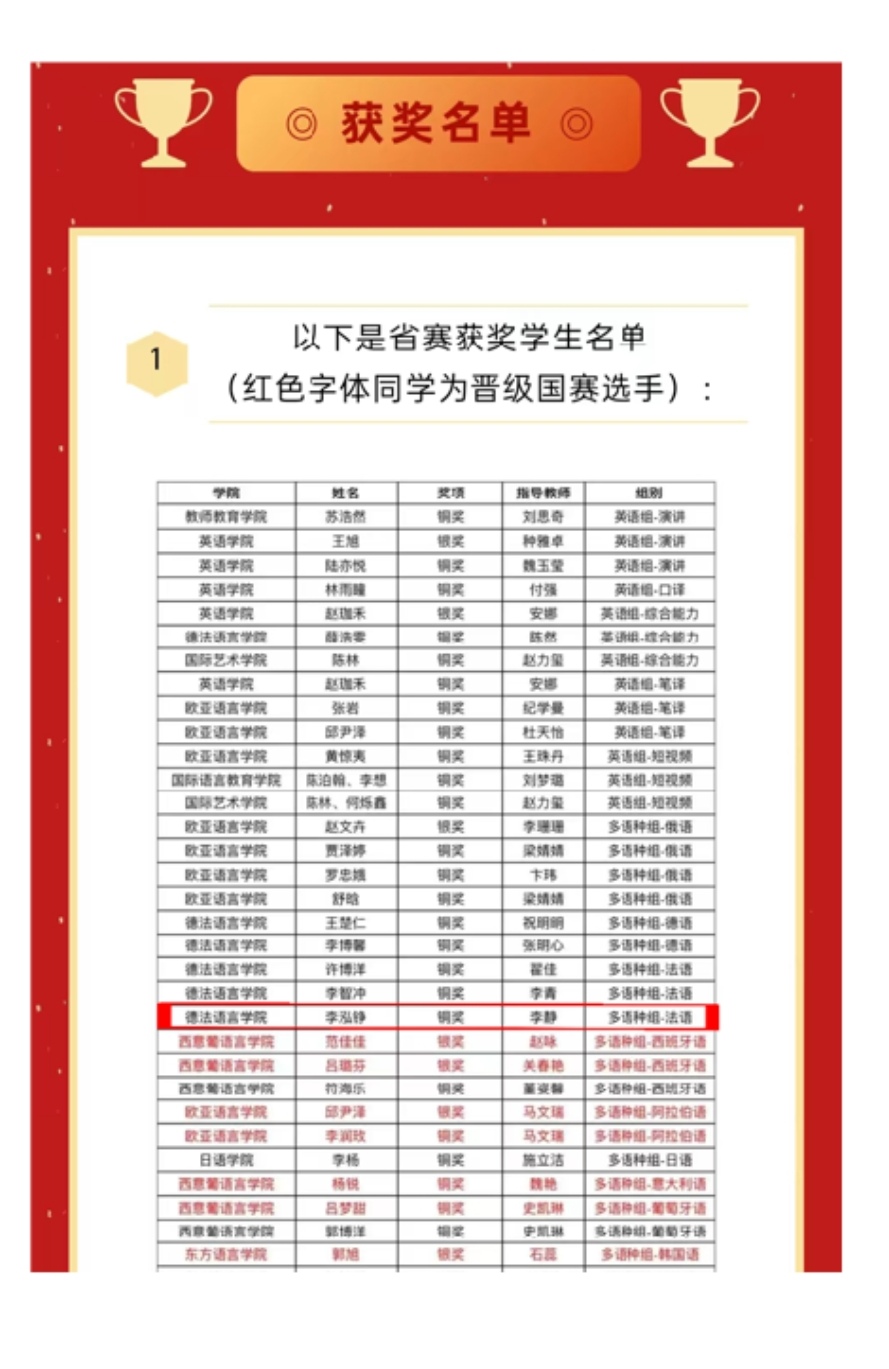 李静老师还带领教学团队学生赫一赛,马淼,吴优优,李泓铮,贾笑颖,翟宇彤、龚文艳、王紫慧,一起参加各类教学比赛。她荣获河北外国语学院2024年"海信杯"教师教学信息化技能竞赛校级二等奖;荣获河北外国语学院2024年微课大赛校级一等奖;指导学生赫一赛荣获2024年度河北省教师教育教学信息化交流活动省级二等奖;指导学生李鸿铮参加外研社国才杯"理解当代中国"大学生外语能力大赛荣获省级铜奖