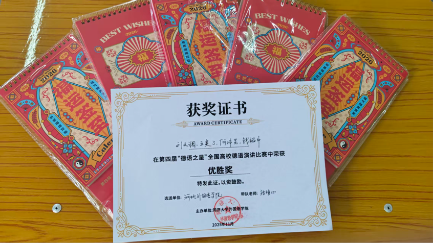 在本次比赛中,河北外国语学院德法语言学院刘文澜、王英了、何沛芸、钱韬中四位同学表现优异,成功斩获第四届“德语之星”全国高校德语演讲比赛决赛优胜奖。