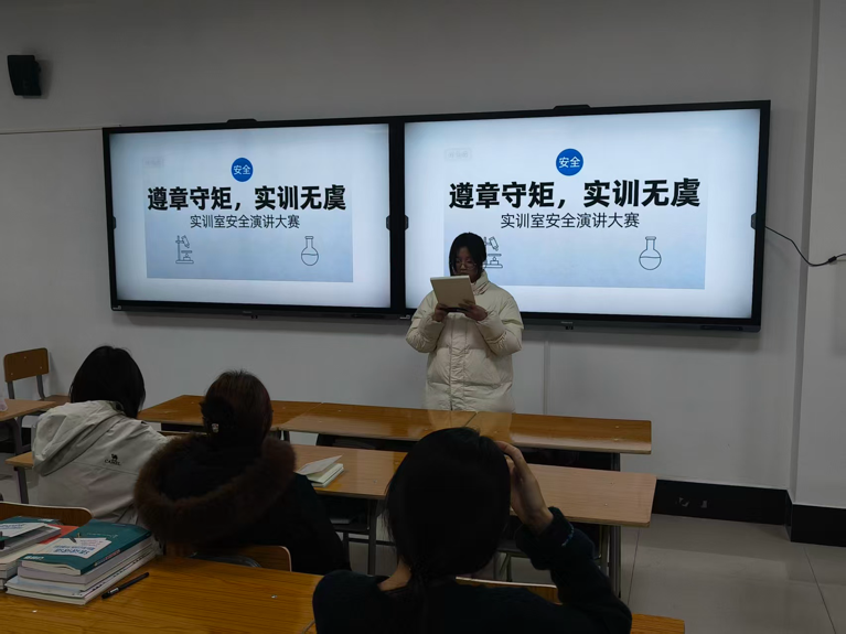 比赛现场,参赛选手们结合自身实训经历,将实训室安全规章、标准化操作规范及应急处置核心要点融入生动鲜活的讲述之中。他们分享实操过程中的安全感悟,剖析实训场景里的风险案例,不仅传递出对安全规则的敬畏之心,更展现出对实训安全的深刻理解与责任担当。