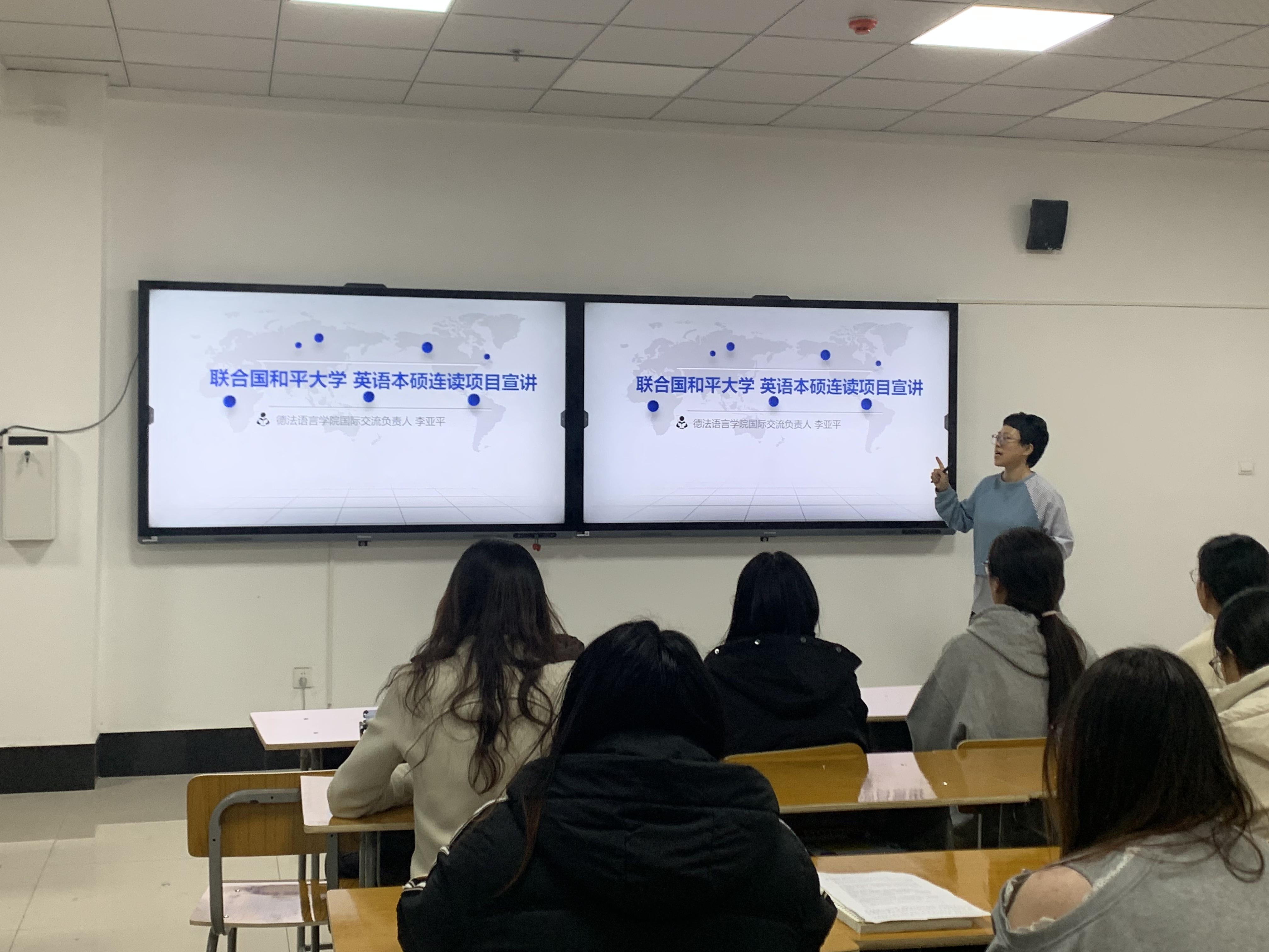 近日,河北外国语学院德法语言学院成功举办联合国和平大学英语本硕连读项目专题宣讲会。本次宣讲会由李亚平老师担任主讲,面向全院有意愿参与本硕连读项目的学生,全面介绍了联合国和平大学的创立背景、教育理念、课程体系以及该项目的独特优势。