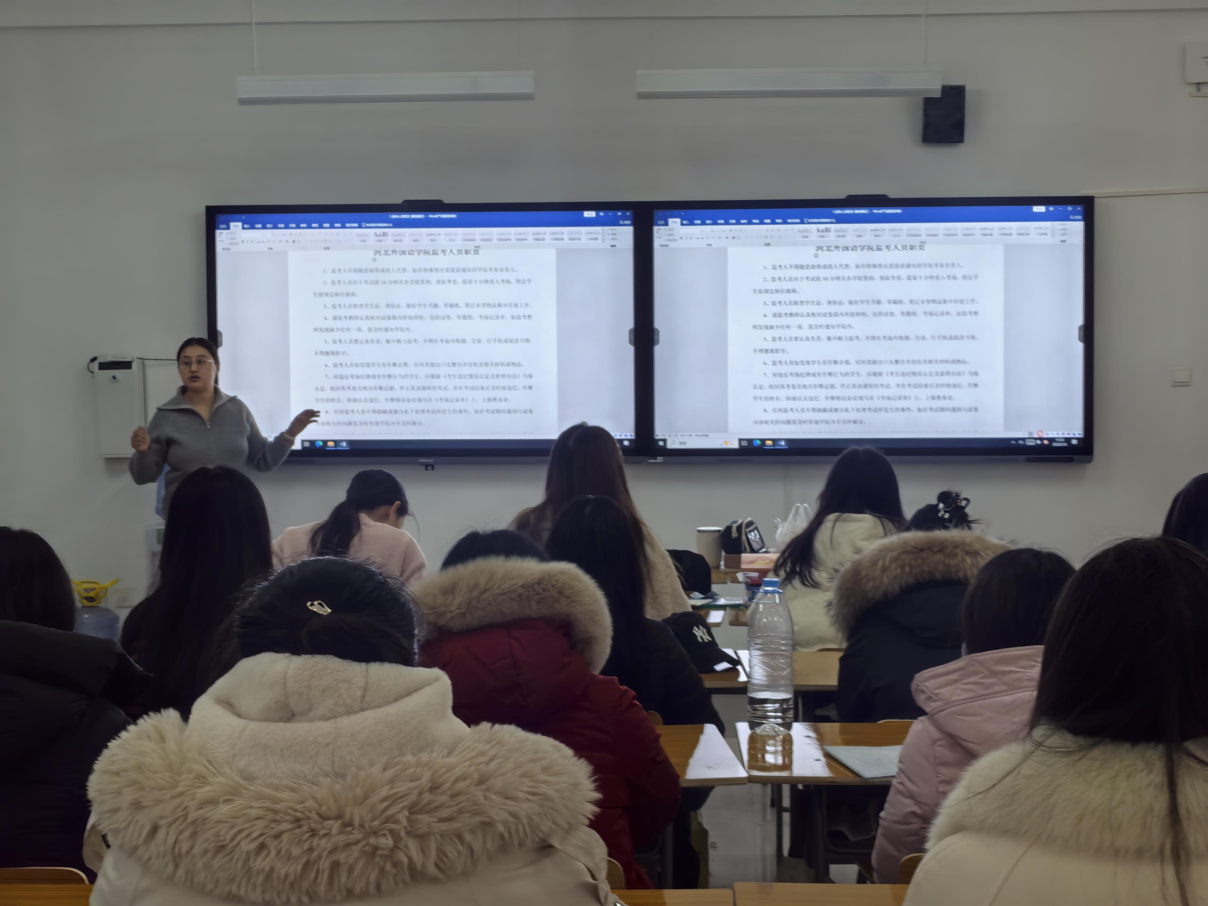 随后,车丽宏老师结合《河北外国语学院监考人员职责》相关规定,从监考人员资质核验、考前各项准备事宜、考场纪律全程维护以及违规行为认定处置等多个维度,逐条明确工作标准与操作规范。她着重强调,全体监考人员必须严守考务纪律红线,以严谨细致、零疏漏的工作态度完成监考任务;考试期间要密切关注考场动态,对任何违规违纪行为坚持“零容忍”,全力保障考试各环节规范有序进行。
