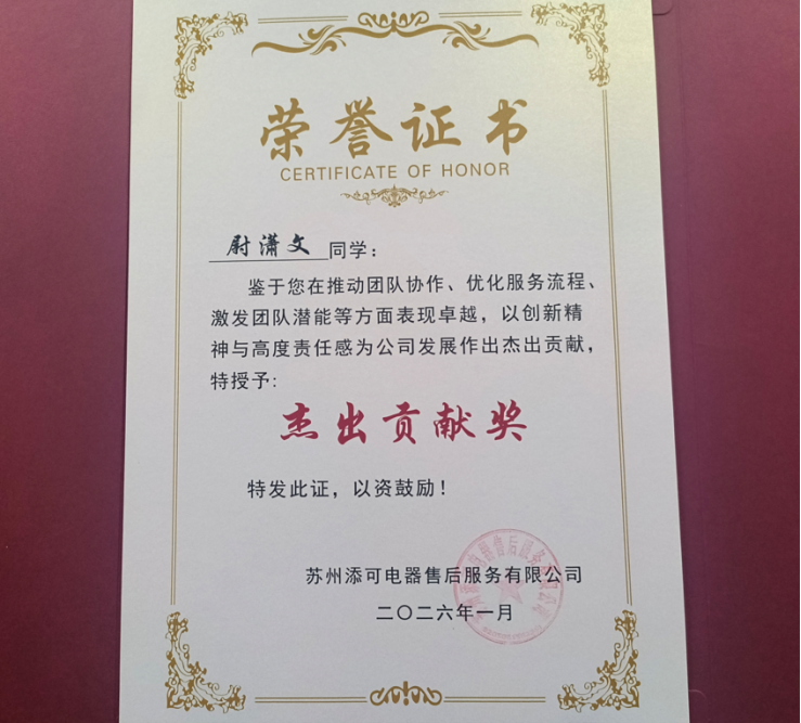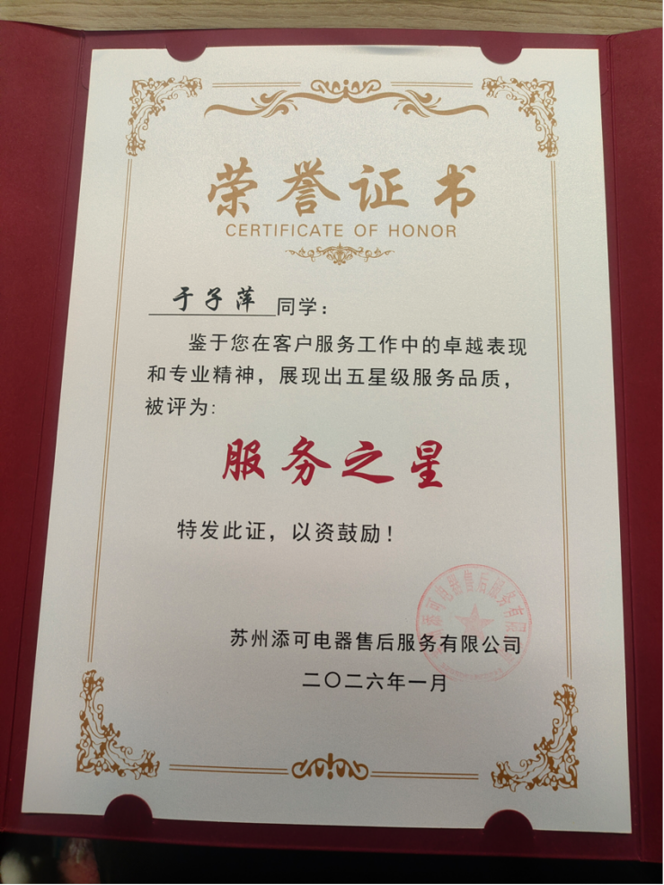 于子萍同学则在客户服务岗位上,凭借耐心倾听与扎实的业务能力展现出五星级服务品质,成为连接企业与用户的坚实桥梁。她表示:“在添可电器客服实习期间,深刻体会到专业与温度并存的重要性。通过耐心倾听和扎实知识解决用户问题,我认识到这是连接企业与用户的桥梁。未来我将继续精进,用专业和温暖服务每一位客户。”